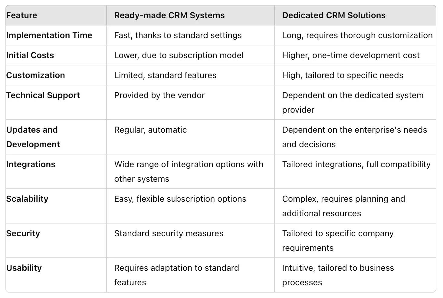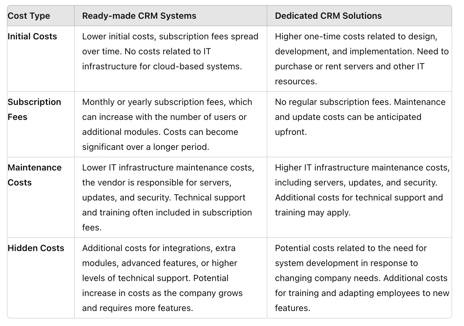 Initial costs of a ready-made CRM system are lower, but subscription fees can add up and become significant over time. Long-term costs of usage may exceed the one-time cost of a dedicated system.